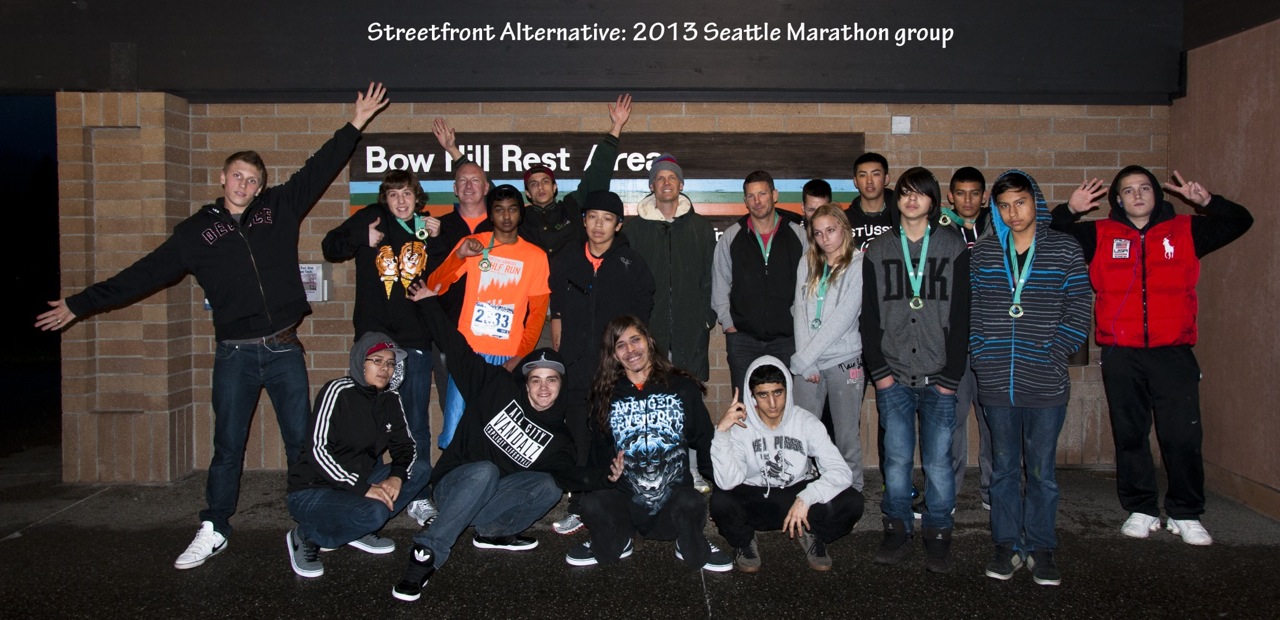 For the 12th consecutive year, Streetfront has driven down to Seattle to have our students run the Seattle Marathon. Things have changed in those 12 years; instead of one boy running alongside his teacher as happened in 2001, this year we had 10 kids running the full (42.2 km) and 3 running the half marathon (21.2 km). We also had 2 wonderful volunteers running the races with the students: Ben Proctor, a super committed volunteer has been training with the kids all year and Brandon Steele, a VPD Officer and marathon trainer extraordinaire.